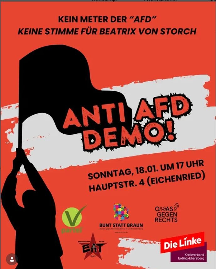 Am diesem Wochenende finden in mehreren benachbarten oberbayerischen Gemeinden Demonstrationen und Kundgebungen gegen rechtsextreme Hetze, populistische Stimmungsmache und AfD-Veranstaltungen statt. Unterstützt die lokalen zivilgesellschaftliche Bündnisse und, Initiativen in den Nachbarlandkreisen